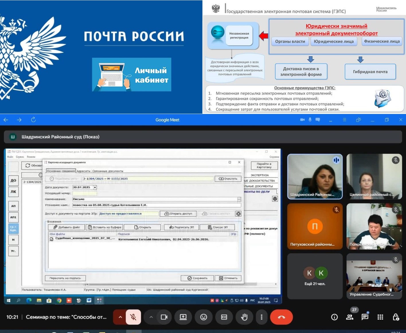 30 июля 2025 года Управлением Судебного департамента в Курганской области совместно с филиалом ФГБУ ИАЦ Судебного департамента в Курганской области и УФПС Курганской области в онлайн-формате проведен семинар с администраторами, начальниками общих отделов и специалистами, ответственными за формирование и отправку почтовой корреспонденции районных судов Курганской области, на тему: «Способы направления почтовой корреспонденции районными судами Курганской области». В ходе семинара до сведения участников были доведены и наглядно продемонстрированы способы отправки судебной корреспонденции посредством программного изделия «Судебное делопроизводство», государственной электронной почтовой системы (ГЭПС), а также личного кабинета АО «Почта России». Докладчики, представители Управления Судебного департамента в Курганской области, ФГБУ «ИАЦ» и УФПС Курганской области в ходе семинара дали ответы на вопросы, поставленные его участниками. Начальником Управления Судебного департамента в Курганской области А.В. Теверёвым внимание присутствующих обращено на необходимость преимущественного и первоочередного использования районными судами региона электронных почтовых отправлений посредством сервисов ГЭПС, ПИ «Судебное делопроизводство» и личного кабинета АО «Почта России». Направление судебной корреспонденции в электронной форме является одним из элементов масштабной работы Судебного департамента при Верховном Суде Российской Федерации по цифровизации судебной системы государства, позволяющее существенно сэкономить расходы федерального бюджета, а также сократить сроки пересылки почтовых отправлений. ![]() |